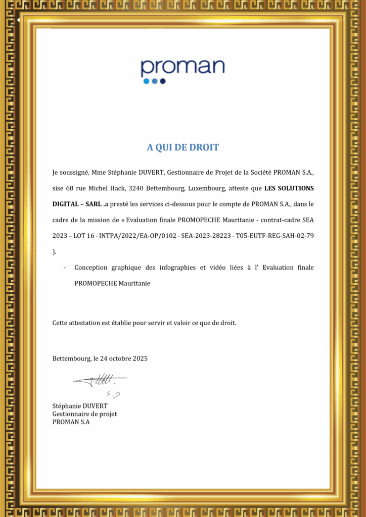“Société Les Solutions Digital a fourni un travail de grande qualité dans la conception graphique des infographies et vidéos liées à l’évaluation finale PROMOPECHE Mauritanie.”
